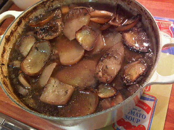 • Cook on low to medium oven 6 hours, taking the lid off after ~4, to crisp the top layer of potatoes